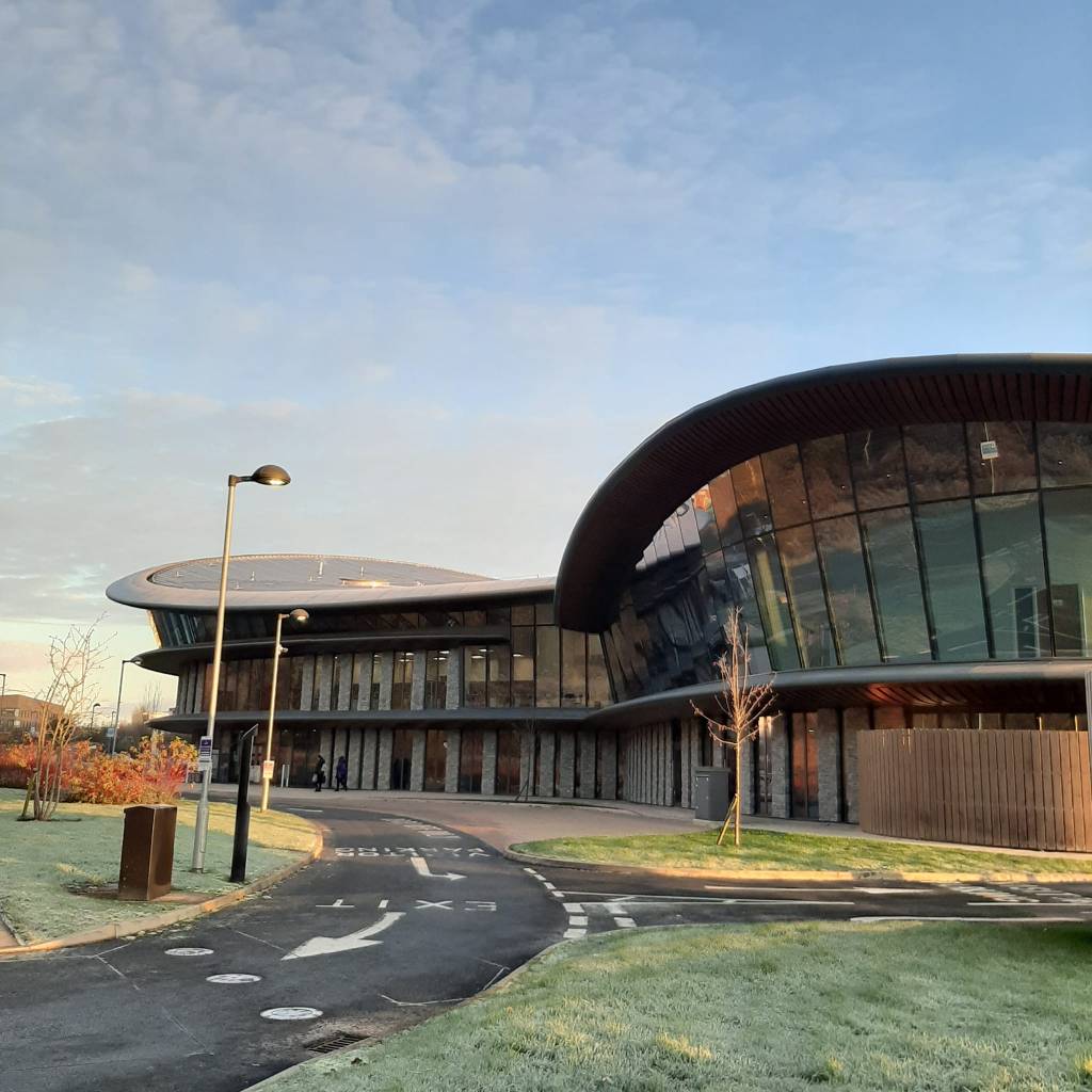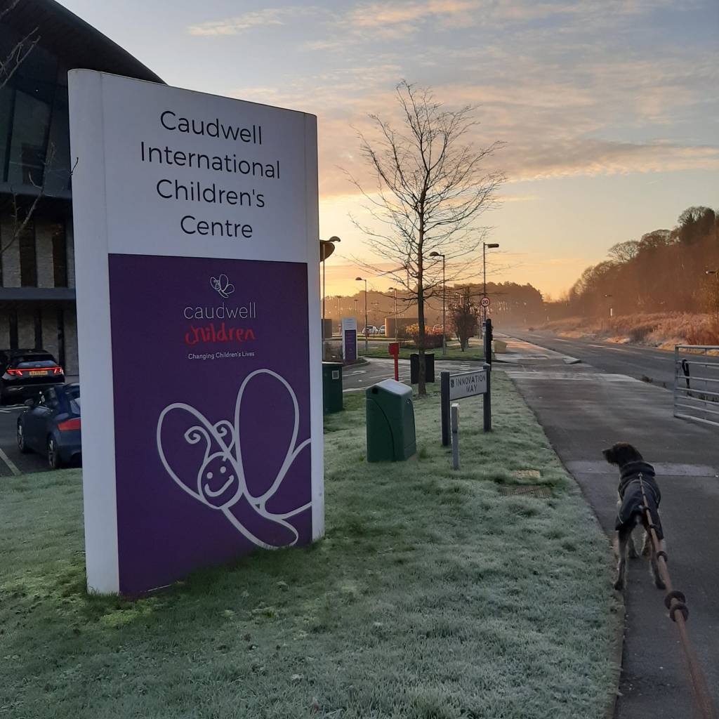 We wake to an early cup of tea in bed and a biscuit. Well, I have the tea and biscuit, Teya makes do with a biscuit. The sun does its winter best to turn the frost into a sparkling playground as we head out for a walk across some lovely grounds. The university gritting lorries are already out so we avoid those paths for Teyaโs paws sake. We head for ponds and an interesting architectural spaceship style building, all stylish glass and metal. I am weirdly happy to find it is the Caudwell International Childrenโs Centre. Caudwell Children is a disabled childrenโs charity aiming