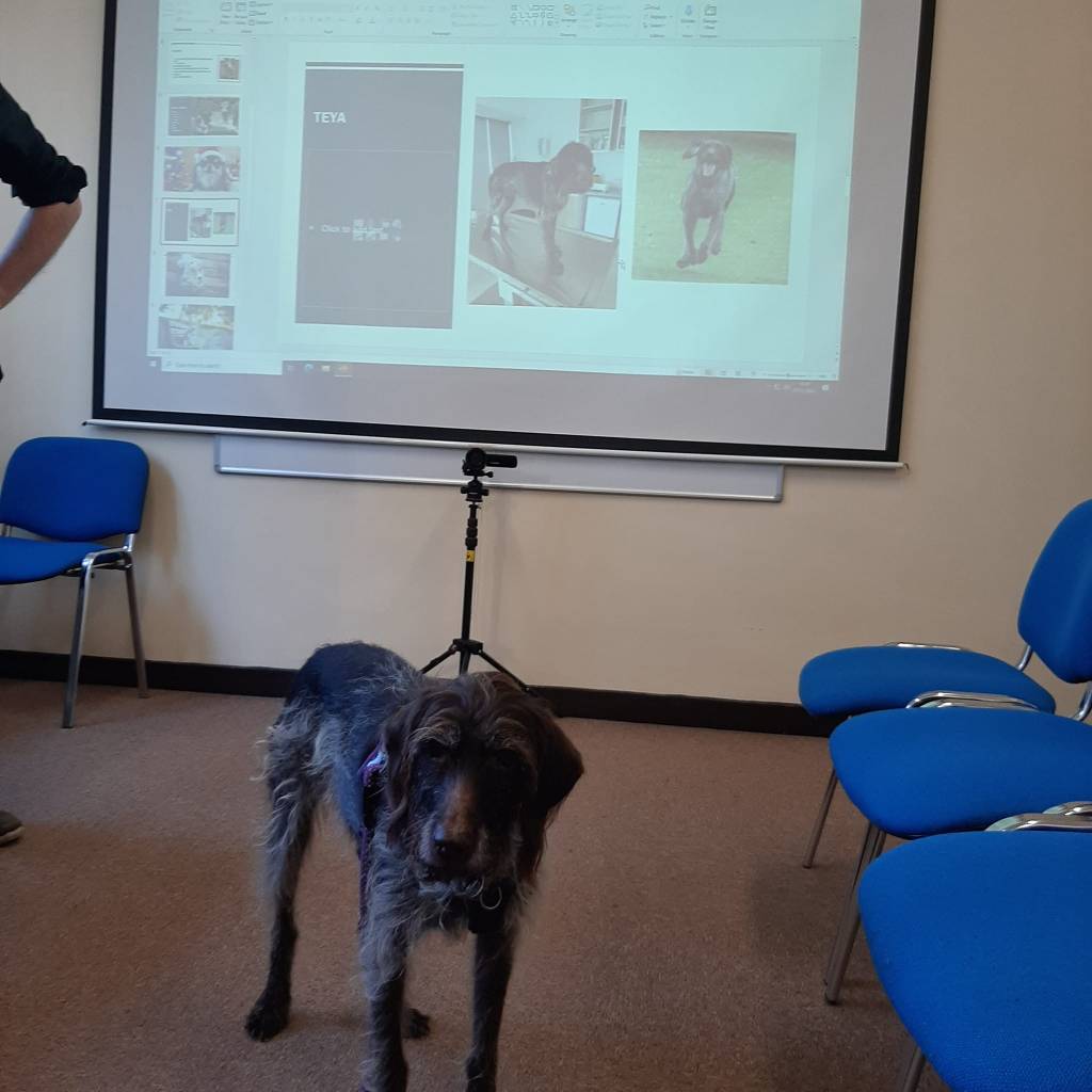 I met Dr Dan, who I already knew, and Mark who was my โminderโ for the stay and ensured we did not get lost on campus. The workshop was fine, the students had plenty to say about pets on campus, and loved Teya- who wouldnโt? We went out for an evening meal which proved a little tricky. Finding both dog friendly/ not full of almost end of term lively students letting off steam, and watching the world cup football, was a challenge. I also met the Head of Department. Lively and different discussion, new ideas, sharing of experiences.